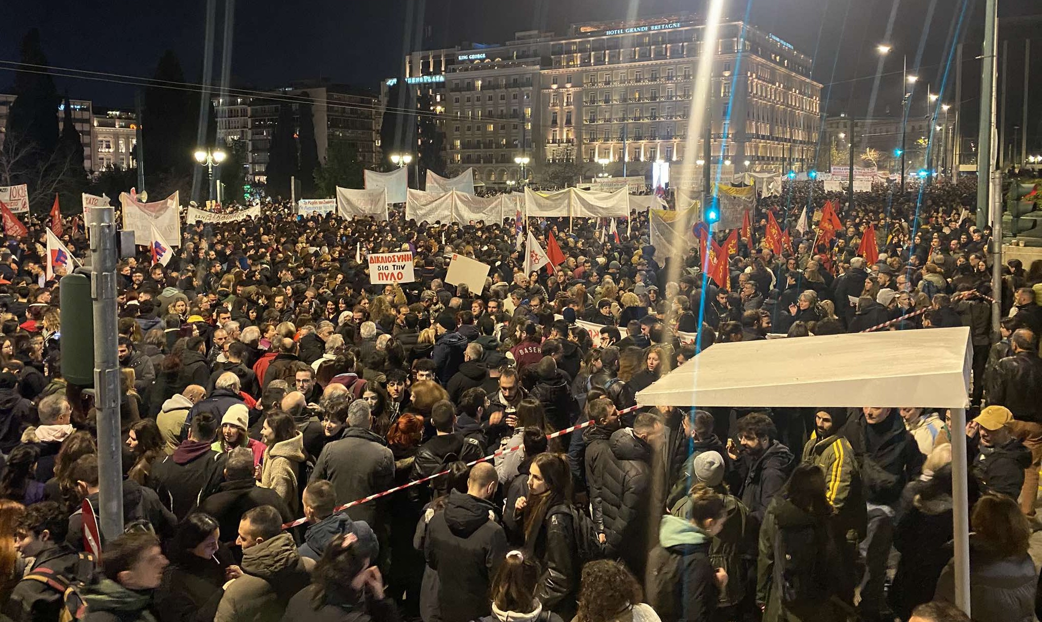 Με τις ομιλίες των εκπροσώπων των εργατικών συνδικάτων και του ψηφίσματος για τη συνέχιση του αγώνα συμπαράστασης στους συγγενείς των θυμάτων του σιδηροδρομικού δυστυχήματος στα Τέμπη, ολοκληρώθηκε το συλλαλητήριο που διοργάνωσαν απόψε τα εργατικά συνδικάτα, κέντρα κι ομοσπονδίες στο Σύνταγμα. Από την εξέδρα ο Βασίλης Ζαβογιάννης,